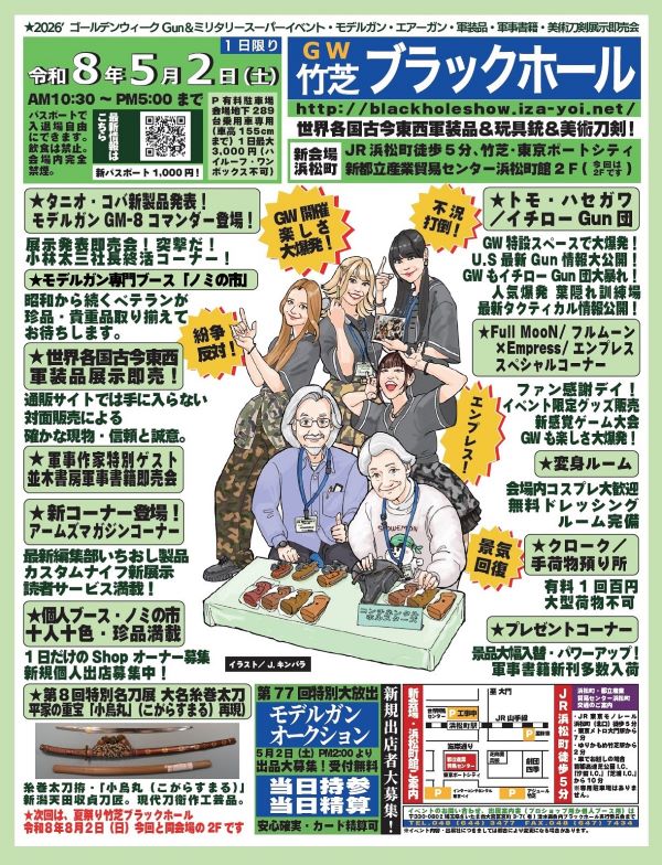| 4月の休業予定 ♢4月23日(木)は、刀剣会全国大会参加の為、休業致します。 ◇5月1日(金)~3日(日)は、 GW竹芝ブラックホールの為、休業致します。 5月2日(土)GW竹芝ブラックホール開催 ☆毎週火曜日・水曜日は、定休日です。 刀剣会等、急遽予定変更になる場合があります。 その場合は、再度掲載いたします。 ![]() 〇刀剣市のご案内 4月26日(日) AM11:00より刀剣市開催します。 |