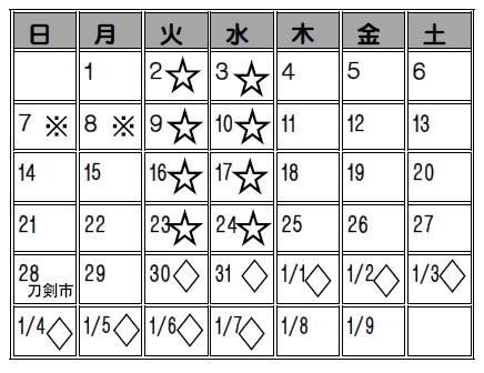 | 12月の休業予定 ☆毎週火曜日・水曜日は、定休日です。 ※12月7日・8日は、出張のため臨時休業致します。 ♢30日(火)~1月7日(水)は、年末年始休業致します。 刀剣会等、急遽予定変更になる場合があります。 その場合は、再度掲載いたします。 ![]() 12月28日(日)AM11:00より刀剣市開催します。 |