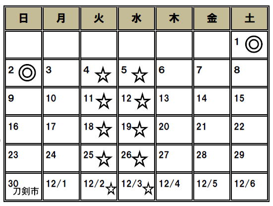 | 11月の休業予定  ◎10月31日(金)~11月2日(日)は、 「大刀剣市」の為、店舗休業致します。 ☆毎週火曜日・水曜日は、定休日です。 刀剣会等、急遽予定変更になる場合があります。 その場合は、再度掲載いたします。 ![]() 11月30日(日)AM11:00より刀剣市開催します。  |