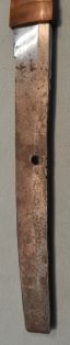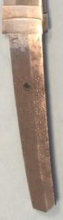 ![]() ![]() ![]() 刃切H-3★江戸時代脇差、研上り白鞘、鎬造り、 銅/銀着2重ハバキ、互の目乱れ。 銘「備中国呰部住為家河野理兵衛尉」(未鑑定)。 ○国重の弟、呰部水田と唱、江戸時代寛永頃。 ◎刃切状態 中間位置 2~3㎜1本 超薄線状 目視やや困難。 江戸時代脇差 「備中国河野為家」在銘 刃切で大処分 下取再入荷 5万円(税込55,000円)
