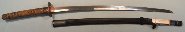 刃切H-1★室町時代打刀、古研白鞘、大磨上、鎬造り、 銅/2重ハバキ、中直刃、無銘。 刀身荒研に近い状態、刃こぼれ、錆は無、経年劣化有。 実用品、研練習用に最適。 ◎刃切状態 ハバキより10cm上、5~7㎜位1本 極薄線状、目視可。 室町時代打刀 白鞘 実用品 研練習用最適 刃切で激安大処分 6万円(税込66,000円)