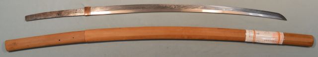 刃切B―3★江戸時代打刀、研済白鞘、木ハバキ、 鎬造り、互の目乱れ、無銘。 錆有(血振り不充分な状態で納刀すると発生する錆)。 鎬筋高く鋭利な刀身。 ◎刃切状態 物打辺2ヶ所有 細長い線状片刃切。片側目視可 江戸時代打刀 白鞘 長寸刀 武道用にも実用品にも最適 刃切で大処分 初回売り出し11万円の品 半額 5万5千円(税込60,500円)