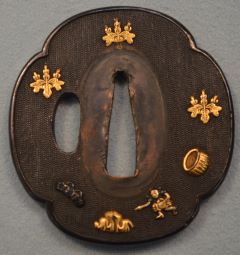 9-17★江戸時代打刀、時代拵/大星白鮫薄茶糸巻、 カマキリ目貫、切付彫鉄金具変り頭・縁・鍔、黒石目鞘、 鉄大型小尻、黒下緒。鎬造り、銅ハバキ、互の目乱れ。 無銘。内外共保存状態極上品。 江戸時代打刀 時代拵 傑作小道具揃い 収集家向 大奉仕 初回売出し32万円の品 さらに1割引 28万8千円(税込316,800円)