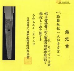 1-19★江戸時代脇差、研上り白鞘、鎬造り、 銅ハバキ、小互の目乱れ。銘「備中守橘康廣・菊紋」 日本美術刀剣保存協会・特別保存刀剣。 刀剣研究連合会・得能一男先生鑑定書。 江戸時代脇差 白鞘 銘「備中守橘康廣」特別保存刀剣 大奉仕 62万円(税込682,000円)