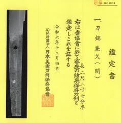 1-22★室町時代打刀、大磨上、研上り白鞘、鎬造り、 銅/銀着ハバキ、浅いのたれ刃乱れ交り。 銘「兼久」日本美術刀剣保存協会・保存刀剣「関」。 身巾広く重ね厚く豪壮な刀。鑑賞用にも、 古武道居合道最適おすすめ品。物斬れしそうな鋭利な刀身。 室町時代打刀 白鞘 銘「兼久」日刀保・保存刀剣 大奉仕 44万円(税込484,000円)