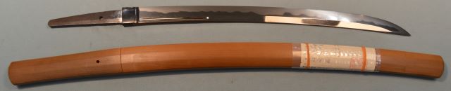 1-12★室町時代寸延べ短刀(登録脇差)、研上り白鞘、平造り、 銅/銀着ハバキ、小互の目乱れ。 銘「備州長船勝光・大永二年八月日」(未鑑定) 室町時代寸延べ短刀 白鞘 銘「備州長船勝光」在銘 大奉仕 14万円(税込154,000円)