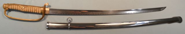軍―70★明治型尉官将校用サーベル型指揮刀、 実戦軍刀、1環吊、尉官刀緒有。 全長106cm、刀身長87.5cm、棒樋、小互の目乱れ。柄に家紋。 保存状態良好。※住所地条令による規制有、要確認。 日本陸軍尉官将校用サーベル型指揮刀 コレクター向 初回売り出し3万円の品 さらに1割引 2万7千円(税込29,700円) |