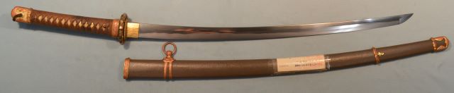 軍―69★日本陸軍将校用鉄鞘軍刀、1環吊、白鮫茶糸巻、 ヒモ猿手、ラッチ止金具可動、ほぼ未使用、コレクターズ・グレード。 刀身:現代刀、鎬造り、銅/金着軍刀ハバキ、大のたれ刃、 銘「関住高崎金繁作」、軍刀鍛冶刀匠、高崎三郎。 刀身未使用、生ぶ刃有。内外共保存状態極上品、ほぼ未使用、 新品同様、コレクターズ・グレード、掘出物。 98式将校用鉄鞘軍刀 銘「関住高崎金繁作」未使用完品 コレクター向 初回売り出し35万円の品 さらに1割引 31万5千円(税込346,500円)