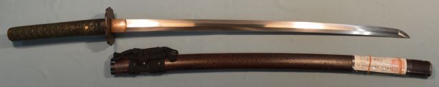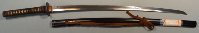 4-26★室町時代打刀、時代拵/白鮫黒糸巻、蝶図頭、 魚子地縁、鉄鍔、黒塗鞘、焦茶下緒。 鎬造り、銅2重ハバキ、互の目乱れ。無銘。小傷有。 長寸刀、武道用最適おすすめ品。今月の特別大奉仕品。 室町時代打刀 時代拵 古刀姿 武道用長寸刀にも最適 大奉仕 18万円(税込198,000円)