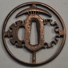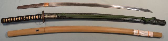 4-24★室町時代打刀、研上り白鞘、時代拵/大星白鮫黒糸巻、 赤胴魚子鳥と花図縁頭、鉄透シ鍔、青貝散らし塗鞘、緑下緒。 鎬造り、銅ハバキ、互の目乱れ。内外共保存状態極上品。 銘「藤島友重」(未鑑定) 室町時代打刀 白鞘 時代拵 銘「藤島友重」在銘 大奉仕 56万円(税込616,000円)