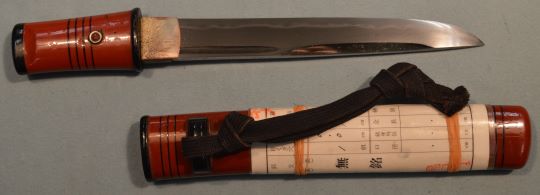 4-28★室町時代短刀、時代拵/総木製、朱塗黒線飾り、 小型合口短刀、鵜の首造り、腰樋、銅/銀着ハバキ、互の目乱れ。 室町時代短刀 時代拵 軽量小型 合口短刀 今月のお買得サービス品 7万円(税込77,000円)