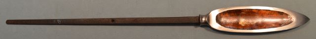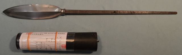 4-29★室町時代笹穂槍、丸筒型槍外装(鞘)、柄は無。 銘「天吉久」(未鑑定)、茎長34.5㎝ 室町時代笹穂槍 外装有 銘「天吉久」在銘 コレクター向 今月のお買得品 11万円(税込121,000円)