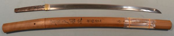 11-28★江戸時代打刀、研上り白鞘、鎬造り、 銅/銀着ハバキ、中直刃、無銘。 「山城守国包」日本美術刀剣保存協会・保存刀剣。 ○国包―二代、江戸時代寛文頃(1661~1672年)、陸前。 本郷吉左衛門。「奥州仙台住山城守藤原国包」。良業物。 江戸時代打刀 白鞘 「山城守国包」仙台国包 保存刀剣 大奉仕 44万円(税込484,000円)