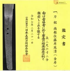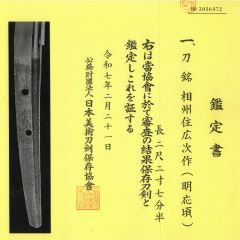 ★室町時代打刀、研上り白鞘、 時代拵/研出鮫鞘打刀拵・日刀保 特別貴重小道具。 鎬造り、銅/金着ハバキ、棒樋、互の目乱れ。 銘「相州住廣次作」日本美術刀剣保存協会・保存刀剣、特別貴重刀剣。 内外共保存状態極上品。相州伝傑作刀。 華麗なる古刀姿、在銘正真健全刀。 ○広次―三代、文明頃(1469~1486年)、相模。市川長兵衛。 長命の鍛冶で、永正頃まで作刀とする。 当初、初代相州住広次の鑑定でしたが、 得能先生刀工大鑑では、作刀を見ずとあり、 令和7年新たな保存鑑定で、明応頃(1492~1500年)の見極め。三代。 室町時代打刀 白鞘 時代拵 銘「相州住廣次作」保存刀剣 日刀保鑑定書3枚付 委託品 200万円(税込2,200,000円)