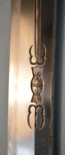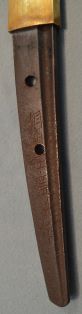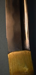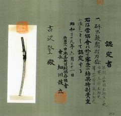 ★鎌倉時代長巻、研上り白鞘、鎬造り、銅/金着2重ハバキ、 棒樋、細樋、浅いのたれ刃。 日本美術刀剣保存協会・特別保存刀剣「古波平」 ○古波平(こなみのひら)―薩摩国谷山郡波平の地に 永延頃「正国」が来住。波平派の祖となる。 古波平とは、南北朝期を降らない一派の刀工及びその作刀の汎称。 ○鎌倉時代/南北朝時代に製作された太刀で、 初期姿、柄が打刀のように短い。 上杉謙信所用の長巻は、太刀に長巻拵をつけている。(鎌倉時代太刀長巻拵) 鎌倉時代片山一文字の豪壮な太刀で、「鬼を斬り裂く」といわれる。 この長巻は、「古波平」と鑑定され、上記によく近似した豪壮な長巻/太刀。 (初期長巻は、太刀拵で腰に佩刀して使用されていた。) 鎌倉時代長巻 白鞘「古波平」 南北朝時代の豪壮な長巻 大刀剣市出品刀 200万円 (税込220万円)