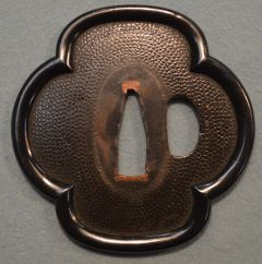 ★室町時代打刀、時代拵/講武所拵、 兜金、縁、鯉口、柏葉、小尻が一作金具。 大星白鮫、金茶糸巻、鉄透し鍔、黒石目鞘、鎬造り、 銅2重ハバキ、浅いのたれ刃交り。 銘「南都住藤原延清」日本美術刀剣保存協会・保存刀剣。 長寸刀、2尺6寸2分有、踏ん張りのある豪壮な刀。 ○延清―室町時代天文頃(1532~1554年)大和。金房。藤原住。 末手掻延清の子で、末手掻の傍系である金房に加わっている。 室町時代打刀 時代拵 銘「南都住藤原延清」 日刀保・保存刀剣 50万円(税込55万円)