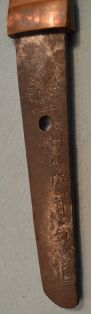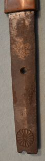 3-33★江戸時代脇差、研済白鞘、大磨上無銘、鎬造り、 銅ハバキ、互の目乱れ。 中子に菊紋有。無銘。保存状態良好。 江戸時代脇差 白鞘 大磨上無銘 菊紋有 今月のお買得サービス品 6万円(税込66,000円)