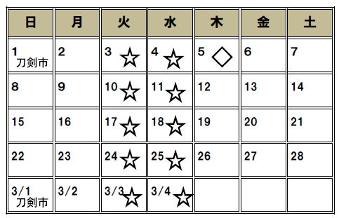 | 2月の休業予定 ☆毎週火曜日・水曜日は、定休日です。 ♢5日(木)は、刀剣会参加の為、休業致します。 刀剣会等、急遽予定変更になる場合があります。 その場合は、再度掲載いたします。 ![]() 〇刀剣市のご案内 2月1日(日)・3月1日(日) AM11:00より刀剣市開催します。 |
