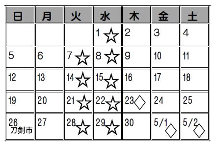 | 4月の休業予定 ♢4月23日(木)は、刀剣会全国大会参加の為、休業致します。 ◇5月1日(金)~3日(日)は、 GW竹芝ブラックホールの為、休業致します。 5月2日(土)GW竹芝ブラックホール開催 ☆毎週火曜日・水曜日は、定休日です。 刀剣会等、急遽予定変更になる場合があります。 その場合は、再度掲載いたします。 ![]() 〇刀剣市のご案内 4月26日(日) AM11:00より刀剣市開催します。 |