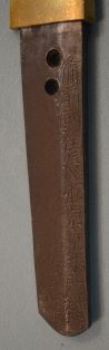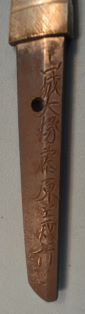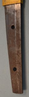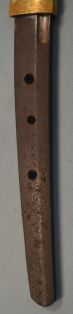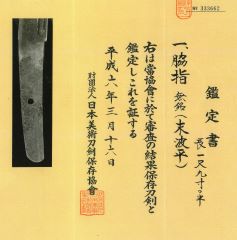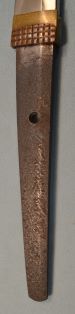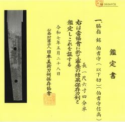 9-13★江戸時代脇差、時代拵/白鮫黒牛皮巻、 鉄金具変り頭、縁、鉄木瓜形切付彫鍔、黒石目鞘、 鉄小尻、焦茶下緒。鎬造り、大磨上。 銘「伯耆守」以下切、日本美術刀剣保存協会・保存刀剣「伯耆守信高」 ○信高―初代、江戸時代慶長(1596~1614年)頃、尾張。河村左衛門。 本国美濃関。三阿弥派の兼国の末葉。関白秀次の取次で、伯耆守受領。 江戸時代脇差 時代拵 銘「伯耆守(信高)」保存刀剣 大奉仕 初回売出し44万円の品 さらに1割引 39万6千円(税込435,600円)
