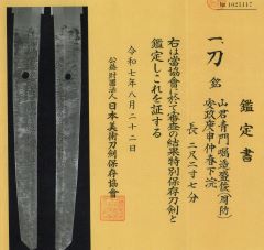 10-2★江戸時代打刀、研上り白鞘、時代拵/大星白鮫黒糸巻、 鉄金線象嵌透し鍔、赤銅魚子牡丹の図縁頭、紺下緒、黒石目鞘。 鎬造り、銅/金着ハバキ、棒樋に添樋、互の目乱れ。 銘「山君青門嘱造盛俊・安政庚申仲春下浣」 日本美術刀剣保存協会・特別保存刀剣。 刀苑社(とおえんしゃ)認定書2枚。保存状態極上品。 ○盛俊―初代、江戸時代嘉永頃(18485~1853年)、周防。 岩本清左衛門。「防州岩国住青龍軒盛俊造之」、 長運斎綱俊・宗次 門人。岩国藩工。 江戸時代打刀 白鞘 青龍軒盛俊 特別保存刀剣 貴重資料銘 大奉仕 100万円(税込110万円)