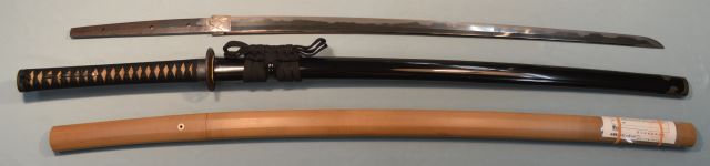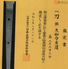 10-3★江戸時代打刀、時代拵/大星白鮫黒糸巻、 赤銅魚子菊花図縁頭、蝦蟇仙人図鉄鍔、黒塗鞘、黒下緒。 鎬造り、銅/金着ハバキ、互の目乱れ。 銘「大和守吉道」日本美術刀剣保存協会・特別保存刀剣。 ○吉道―二代(よしみち)、江戸時代延宝頃(1673~1680年)、播磨。姫路で鍛刀したので「姫路大和」、 水戸義公に招かれて、水戸七軒町にて鍛刀した。業物。 江戸時代打刀 時代拵 銘「大和守吉道」特別保存刀剣 姫路大和 大奉仕 134万円(税込1,474,000円)