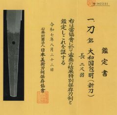 10-4★江戸時代打刀、研上り白鞘、時代拵/大星白鮫焦茶糸巻、 赤銅魚子這龍図縁頭、木瓜型鉄鍔、腰刻み黒塗鞘、紺下緒。 鎬造り、銅/金着2重ハバキ、互の目乱れ。 銘「大和国包明」日本美術刀剣保存協会・特別保存刀剣。 特別貴重と特別貴重小道具鑑定書も有。 ○包明―江戸時代元禄頃(1688~1703年)、大和。中川三九郎。 初銘「正吉」。銘を左文字に切る。「左陸奥」包保の甥。 江戸時代打刀 白鞘 時代拵 銘「大和国包明」 特別保存他鑑定書2枚付 大奉仕 90万円(税込99万円)