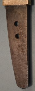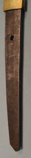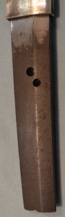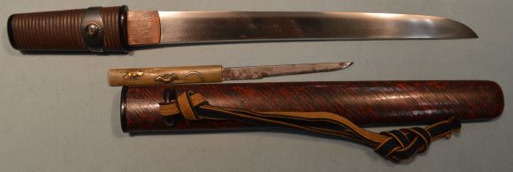 10-9★室町時代脇差、研上り白鞘、時代拵/白鮫黒細糸巻、 波の図鉄金具縁頭、鉄丸鍔、黒石目木目刻み鞘、大型鉄小尻。 平造り、白銀ハバキ、互の目乱れ。 銘「兼社」日本美術刀剣保存協会・保存刀剣。 ○兼社―かねもり、室町時代天文頃(1532~1554年)、 濃州関住兼社。 室町時代脇差 白鞘 時代拵 銘「兼社」保存刀剣 大奉仕 50万円(税込55万円)