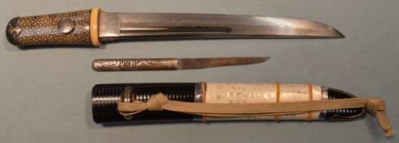 10-6★江戸時代短刀、出鮫合口短刀、時代拵/銀切付彫頭、象牙縁、葵紋目貫。小柄有。黒塗千段刻み鞘、大型小尻、白下緒。 平造り、銅/銀着ハバキ、棒樋、2本樋、互の目乱れ。 銘「備前介宗次・万延元年八月日」(未鑑定) ○宗次―江戸時代天保頃(1830~1843年)、武蔵。 固山宗兵衛。加藤綱英門人。 江戸時代短刀 出鮫合口拵 銘「備前介宗次」内外共保存状態極上品 大奉仕33万円(税込363,000円)