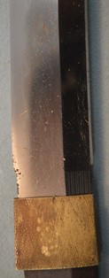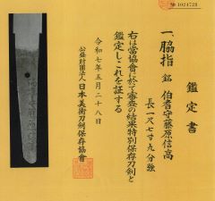 8-1★江戸時代脇差、研上り白鞘、鎬造り、 銅/銀着ハバキ、互の目乱れ。 銘「伯耆守藤原信高」日本美術刀剣保存協会・特別貴重・特別保存刀剣。 極小錆有。 ○信高―二代、江戸時代寛永頃(1624~1643年)、尾張。 河村伯耆。初代信高の子。 江戸時代脇差 白鞘 銘「伯耆守藤原信高」特別保存刀剣 大奉仕 初回売出し70万円の品 さらに1割引 63万円(税込693,000円)