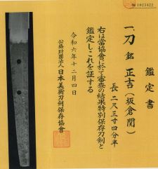 8-2★室町時代打刀、研上り白鞘、時代拵/白鮫濃緑糸巻、半太刀拵、 太刀鍔、朱変り塗、濃緑下緒。鎬造り、真鍮太刀鎺、互の目乱れ。 銘「正吉」日本美術刀剣保存協会 特別保存刀剣。佐藤寒山先生鞘書有。 ○正吉―二代、室町時代、天文(1532~1554年)頃、美濃。板倉関。 室町時代打刀 白鞘 時代拵 銘「正吉」特別保存刀剣 大奉仕 初回売出し96万円の品 さらに1割引 86万4千円(税込950,400円)