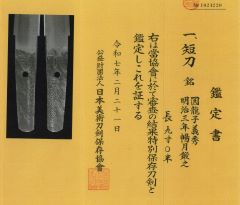 8-9★江戸時代、幕末~明治頃、短刀、 研上り白鞘、鎬造り、白銅ハバキ、直刃。 銘「圓龍子義秀・明治三年暢月鍛之」 日本美術刀剣保存協会・特別保存刀剣。 ○義秀―江戸時代慶応頃(1865~1867年)、武蔵。義勝の子。 中山一貫斉義弘の孫。円龍子国秀門人。本国上野。 江戸時代、幕末~明治頃短刀 白鞘 銘「圓龍子義秀」特別保存 大奉仕 初回売出し36万円の品 さらに1割引 32万4千円(税込396,000円)
