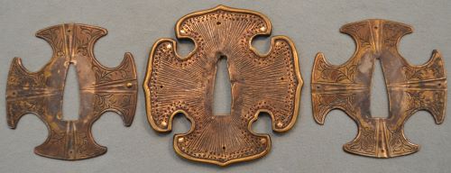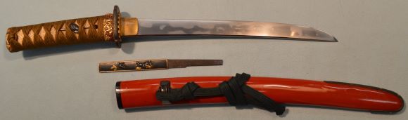 8-8★江戸時代短刀、時代拵/白鮫薄茶糸巻、赤銅菊下唐人図縁頭、 朱鞘、木瓜型鉄鍔、大型小尻、黒下緒。 放駒と猿の図小柄有。平造り、銅/金着ハバキ、皆焼、無銘。 内外共保存状態極上品。 江戸時代短刀 時代拵 平造り皆焼刀身 大奉仕 初回売出し36万円の品 さらに1割引 32万4千円(税込396,000円)