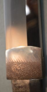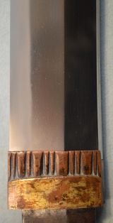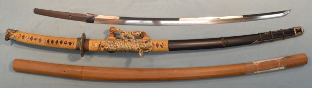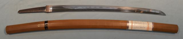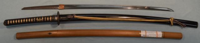 8-4★江戸時代打刀、研上り白鞘、太刀拵/糸巻太刀拵、金茶糸巻、 黒塗鞘、室内装飾向、飾り太刀、現代製、木製つなぎ入。 鎬造り、銅/黒塗ハバキ、互の目乱れ。 銘「長次」日本美術刀剣保存協会 保存刀剣。室内装飾に最適。 ○長次―江戸時代享和(1801~1803年)頃、伊賀国輝の子。 江戸時代打刀 白鞘 太刀拵 銘「長次」保存刀剣 大奉仕 初回売出し80万円の品 さらに1割引 72万円(税込792,000円)