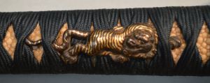 8-3★江戸時代、幕末~明治頃、打刀、研上り白鞘、 時代拵/白鮫、黒細糸巻、鉄金具桜金象嵌、出目貫太刀兜図、 木瓜型鉄鍔、黒塗鞘、変り下緒。 銘「加州金澤住藤原正國作之・明治元年九月吉日」 日本美術刀剣保存協会・特別保存刀剣 ○正国―江戸時代慶応頃(1865~1867年)、加賀。押水甚蔵。 江戸時代 幕末~明治頃 打刀 白鞘 時代拵 銘「加州金澤住藤原正國作之」大奉仕 初回売出し96万円の品 さらに1割引 86万4千円(税込950,400円)