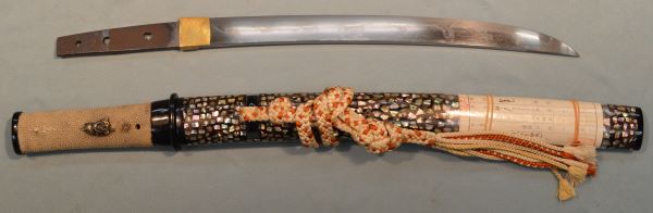 8-10★室町時代脇差、時代拵/出鮫合口拵、 角頭、木製縁・鍔(一体形)、 螺鈿研出鞘、変り下緒。平造り、銅/金着ハバキ、 大乱れ、大磨上げ銘残り有。 銘「仁王清(以下切れ)」日本美術刀剣保存協会・特別貴重刀剣。 室町時代脇差 時代拵 銘「仁王清(以下切れ)」特別貴重 大奉仕 初回売出し27万円の品 さらに1割引 24万3千円(税込267,300円)