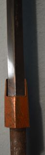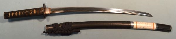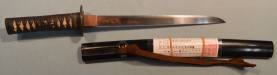 4-26★室町時代打刀、時代拵/白鮫黒糸巻、蝶図頭、 魚子地縁、鉄鍔、黒塗鞘、焦茶下緒。 鎬造り、銅2重ハバキ、互の目乱れ。無銘。小傷有。 長寸刀、武道用最適おすすめ品。今月の特別大奉仕品。 室町時代打刀 時代拵 古刀姿 武道用長寸刀にも最適 大奉仕 18万円(税込198,000円)