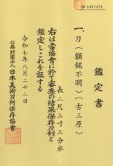 ★鎌倉時代打刀、大磨上無銘(額銘不明)、研済白鞘、鎬造り、 銅/金着2重ハバキ、棒樋、細直刃。 「古三原」日本美術刀剣保存協会・保存刀剣。 ○古三原―備後国三原の地に、鎌倉末期から南北朝期に栄えたもの。 正家、正広、正光、政広等が知られる。大和気質の作風。 鎌倉時代打刀 白鞘 「古三原」日刀保・保存刀剣 大奉仕 初回売出し100万円の品 さらに1割引 90万円(税込99万円)