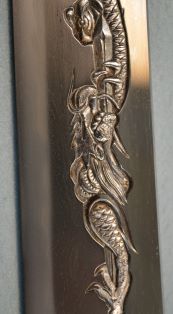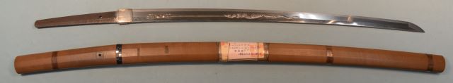 ★江戸時代打刀、研済白鞘、鎬造り、銅/銀着ハバキ、互の目乱れ。 刀身彫有:剣巻龍(独鈷付)倶利迦羅、地肉彫。梵字。 銘「出羽国住人大慶荘司直胤 花押・文化十四年仲秋」(未鑑定) 江戸時代打刀 白鞘 銘「出羽国住人大慶荘司直胤 花押」在銘 大奉仕 初回売出し40万円の品 さらに1割引 36万円(税込396,000円)
